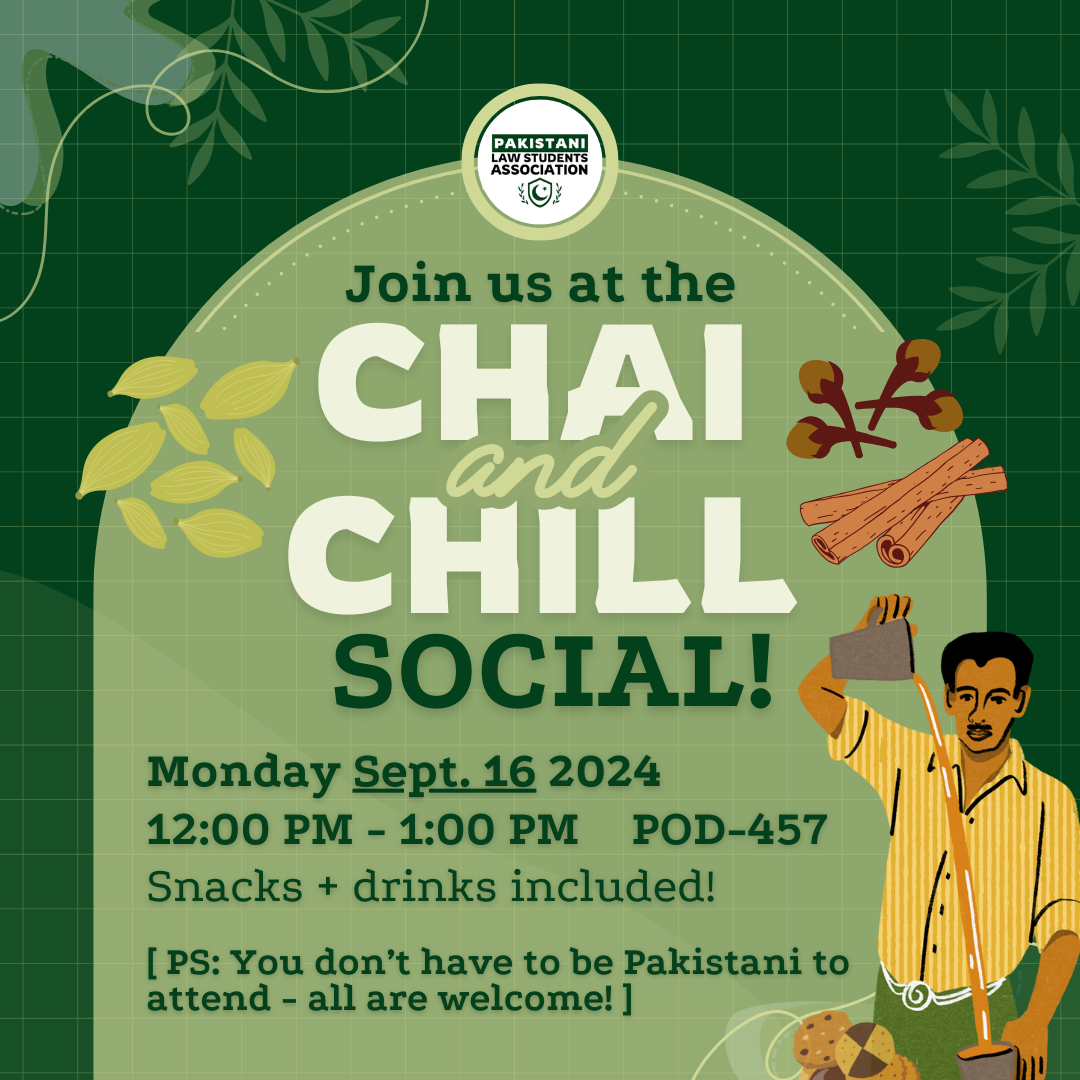 Join the Pakistani Law Students Association for some chai and samosas! We’re excited to introduce our exec team and host our first ever social in history – across Canada! Come for music, snacks, and good vibes ◡̈